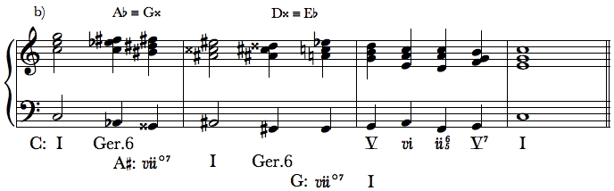 I recommend listening very closely to this one. In particular, notice the change from beat 3 to beat 4 of the first measure. The outer voices do not move, while the alto and tenor descend by slightly less than a semitone. Try to hear the German augmented sixth chord on beat three followed by the diminished seventh chord on beat four while remaining aware of the static soprano and bass. If your ears are trained in conventional harmony, the unfamiliar enharmonic equivalence can be disorienting.