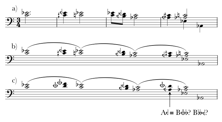 The second movement begins with a prolongation of an A-flat major triad. Example 3.11a shows the first four measures, reduced to a single bass staff. Example 3.11b shows how the A–flat major triad is prolonged by non-chord tones, although the enharmonic spellings of the upper neighbours does not reflect their functions in an obvious way. I'd prefer that the notation reflect a neighbouring motion with adjacent notes on the staff so that, for example, the opening three notes in the upper voice appear as some kind of E-F-E motion instead of E-E-E decorated with accidentals. In Example 3.11c, I've attempted to respell the neighbouring notes with enharmonic equivalents but because there is no good way to represent a five-quarters-flat accidental without introducing another non-standard symbol, it's hard to notate the pitch one quarter-tone above A-flat as some kind of B.