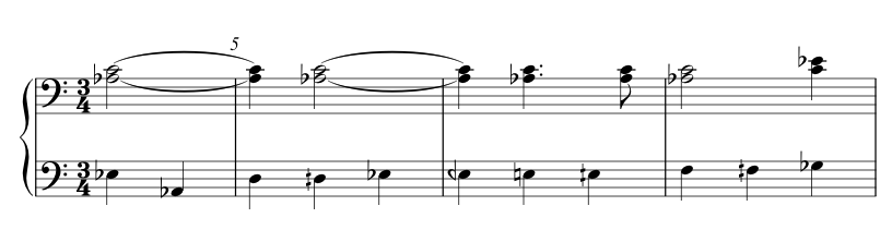 This short passage shows Hába using his concept of "tone centrality" to create oblique counterpoint, with the two upper voices maintaining a pedal A-flat and C over a moving bass.