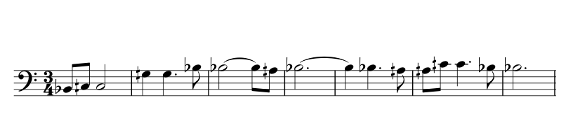Alois Hába, Suite für vier Posaunen, Mvt. III, Allegretto scherzando, melody, mm. 1-7