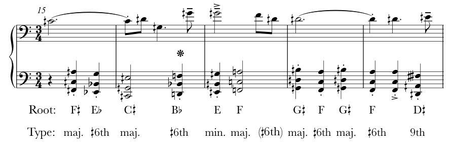 In this passage, the melody is harmonized with major triads, minor triads, and a type of quarter-tone added-sixth chord.