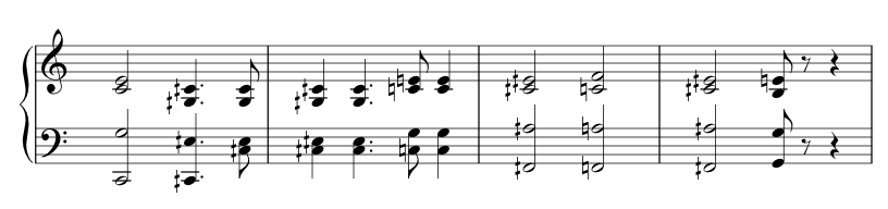 The opening of the fourth-movement chorale is harmonized with a mixture of conventional triads and seventh chords. The identification of these chords is left as an exercise for the reader. We can also observe that the outer voices move in contrary motion when the composition of the chords shifts from conventional pitches to quarter-tone pitches.
